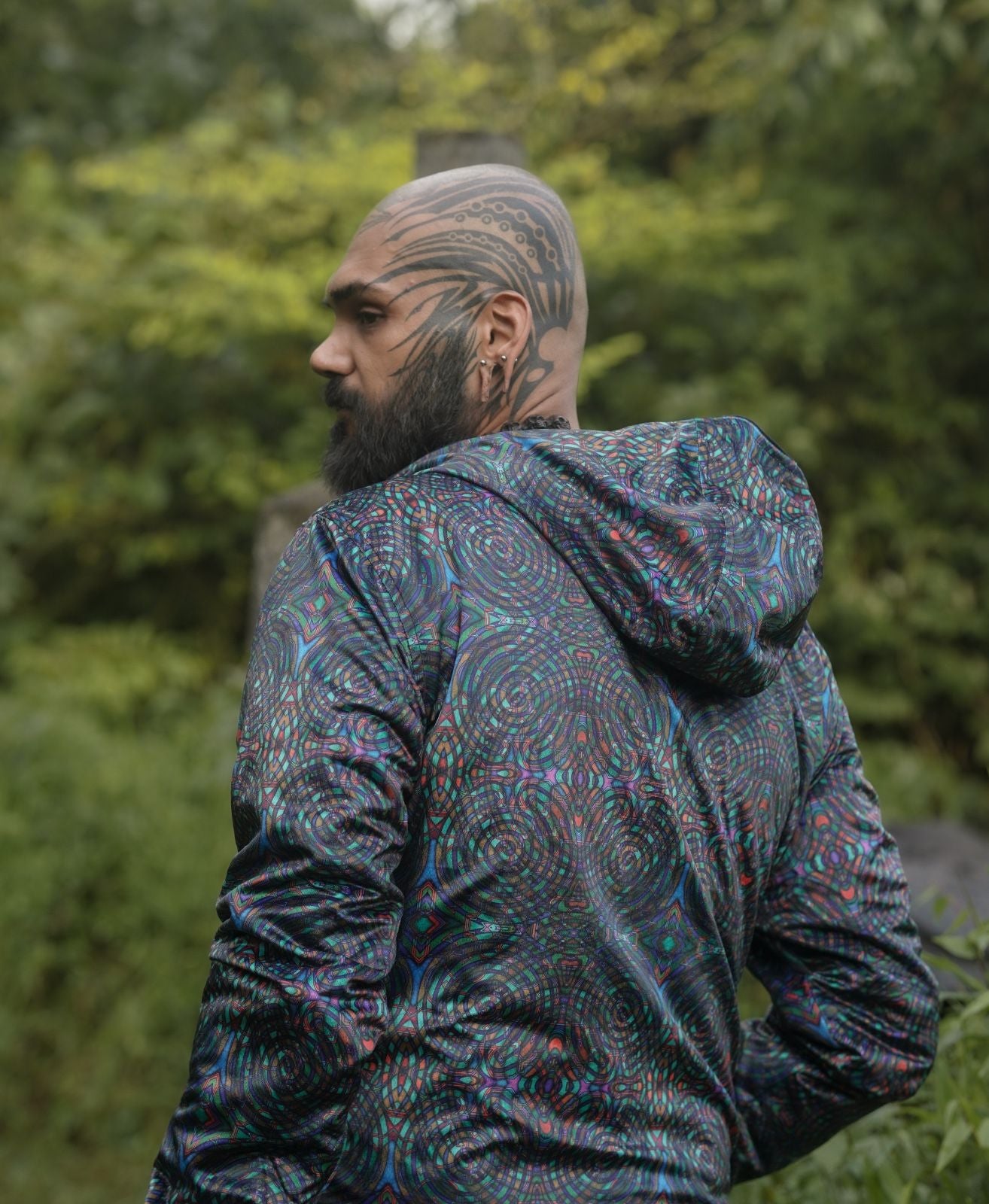 Psychedelic Cyber Punk style Art Men's Party Wear Reversible Jacket —a canvas of expression you can wear two ways, bringing together function, comfort and creativity. Featuring "MYCEDOSCOPE" design, a blend of Mind-Flare and Kaleidoscope together. This Two in One Jacket showcase distinct design unique art wear jacket promises both comfort and durability.